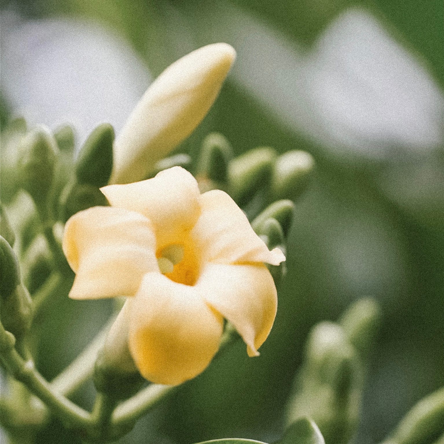 Puakenikeni (Fagraea berteriana) is not native to the Hawaiian islands, nor was it a canoe plant brought by ancient voyagers. Nonetheless, over the last century and a half, it has been adopted here with as much love as if it were Hawai’i’s own, a cherished flowering tree for stringing lei. Its name, meaning “ten cent flower”, harks back to its value per blossom in the late 1800’s when it was so highly prized for its Gardenia-like scent. It’s simple — five-petaled and trumpet shaped — but its intoxicating perfume and magical color changing ability, shifting from white to orange as it ages, makes it one of my absolute favorites.