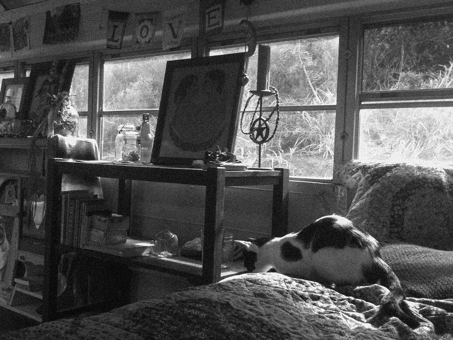Shortly after, a childhood dream come true in the form of a rusted Bluebird school bus whom I affectionately named my Destino. My stationary home on wheels was as old as I was and over the course of a year and a half living cozily within its arched walls, it was also my canvas. Whimsical portraits and lyrics to songs; a favorite storybook from childhood plastered on the ceiling above the bed; hand-built shelves of cork topped jars, seashells, photographs curled up in the humidity.